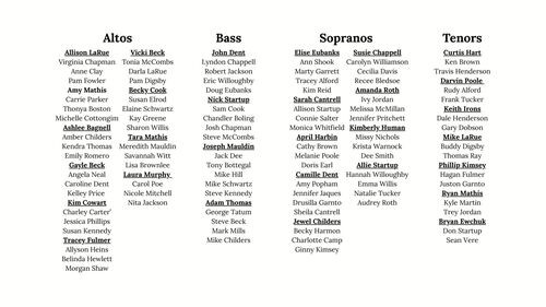 We are starting Care Groups this year! Each member of our worship team will be assigned a small care group so that we can foster relationships, learn how to pray for each other, and take care of our choir family. Below is a list of each care group and their leaders. Your leader will receive your contact information and will reach out soon! The youth members are not included in this list - it was a little too complicated logistically to include minors.